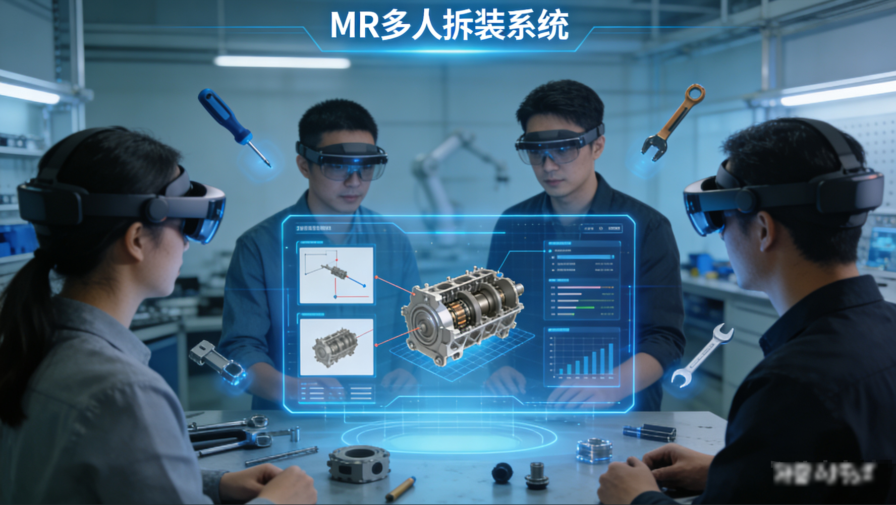 构建 3D 场景与数字孪生,经 MR 设备虚实融合,通过网络同步实现多人实时交互,叠加物理引擎与 AI 实现高仿真训练,解决传统训练成本高、风险大、协同难、评估难等问题。