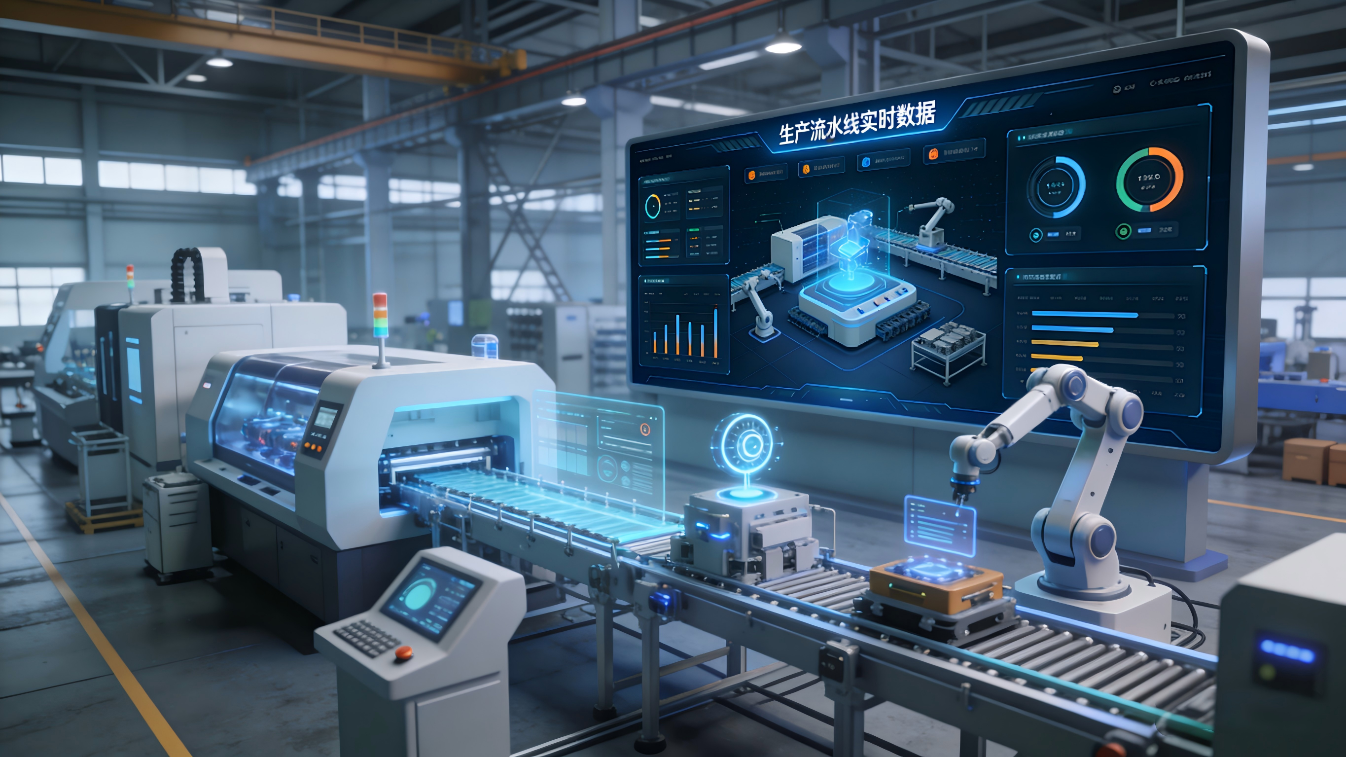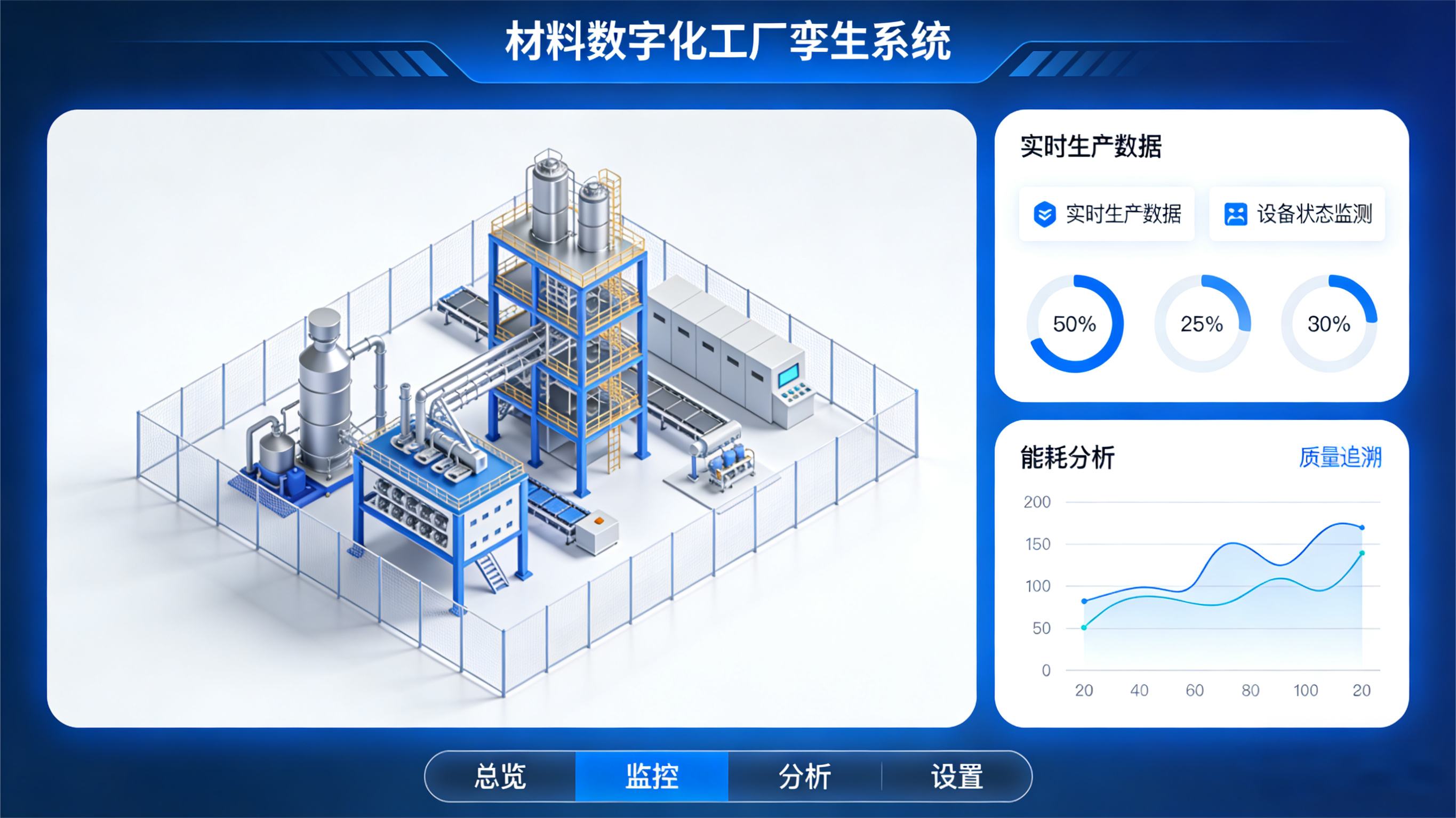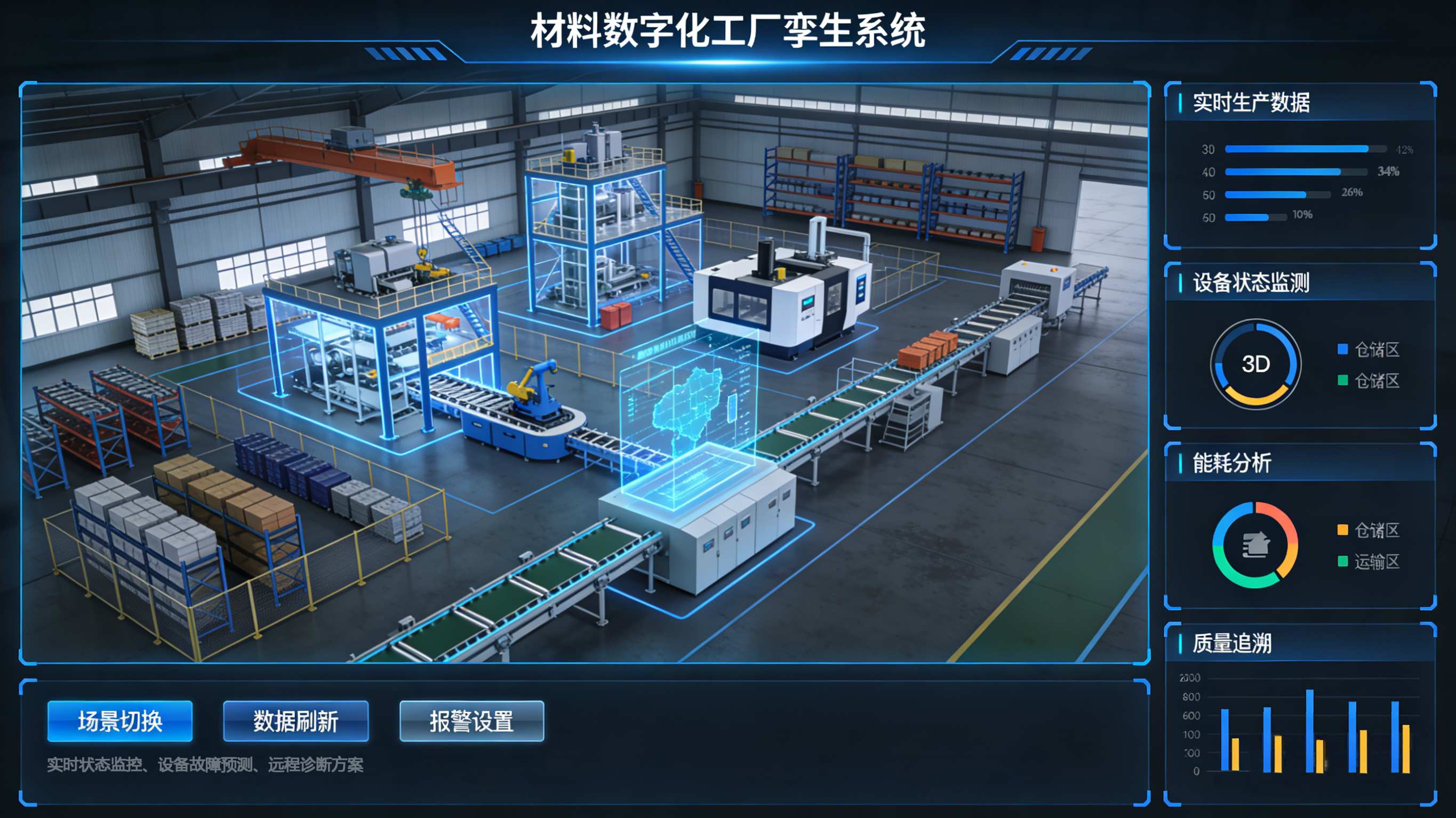 工业多源数据采集融合、高精度三维建模、实时虚实同步、物理仿真、AI 预测与工业闭环控制。